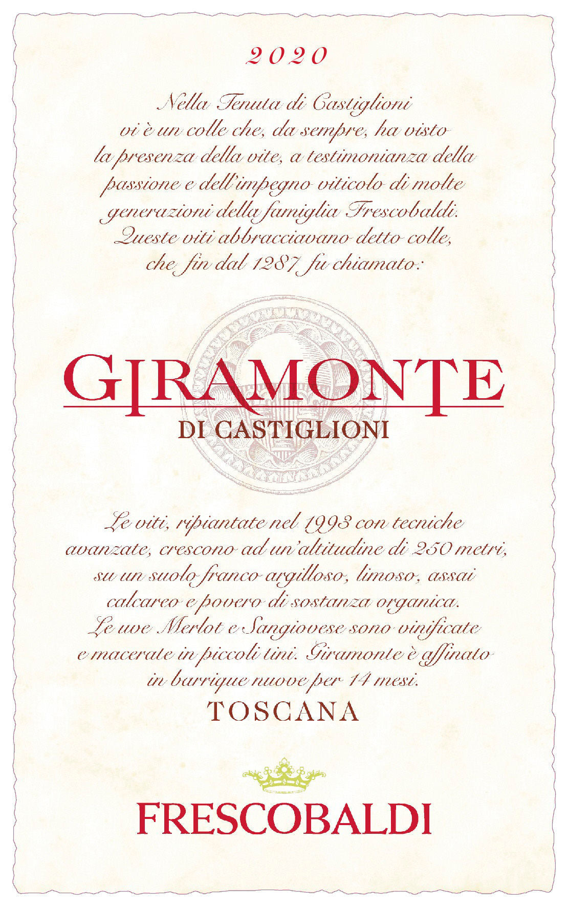 The area was already famous at that time for the high quality of its agricultural crops and was for centuries the center of intense traffic and the chosen place for the construction of luxurious Roman villas. The noble coat of arms of the Frescobaldi family, with the crown, the shield and the three drums, is also represented as a symbol of Castiglioni, to remember the 700 years of winemaking history, which began right on this estate.